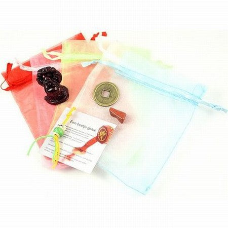 Geluksbuideltje met mini boeddha, muntje, steentje en gelukspoppetje