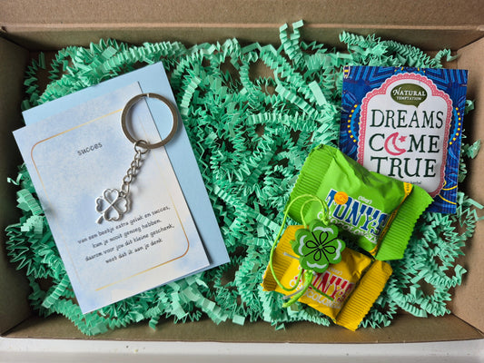 Brievenbuscadeautje succes met sleutelhanger, thee en chocola