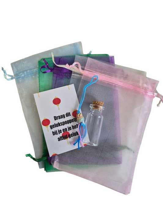 Gelukszakje - organza gelukskadootje met gelukspoppetje steentje en muntje.