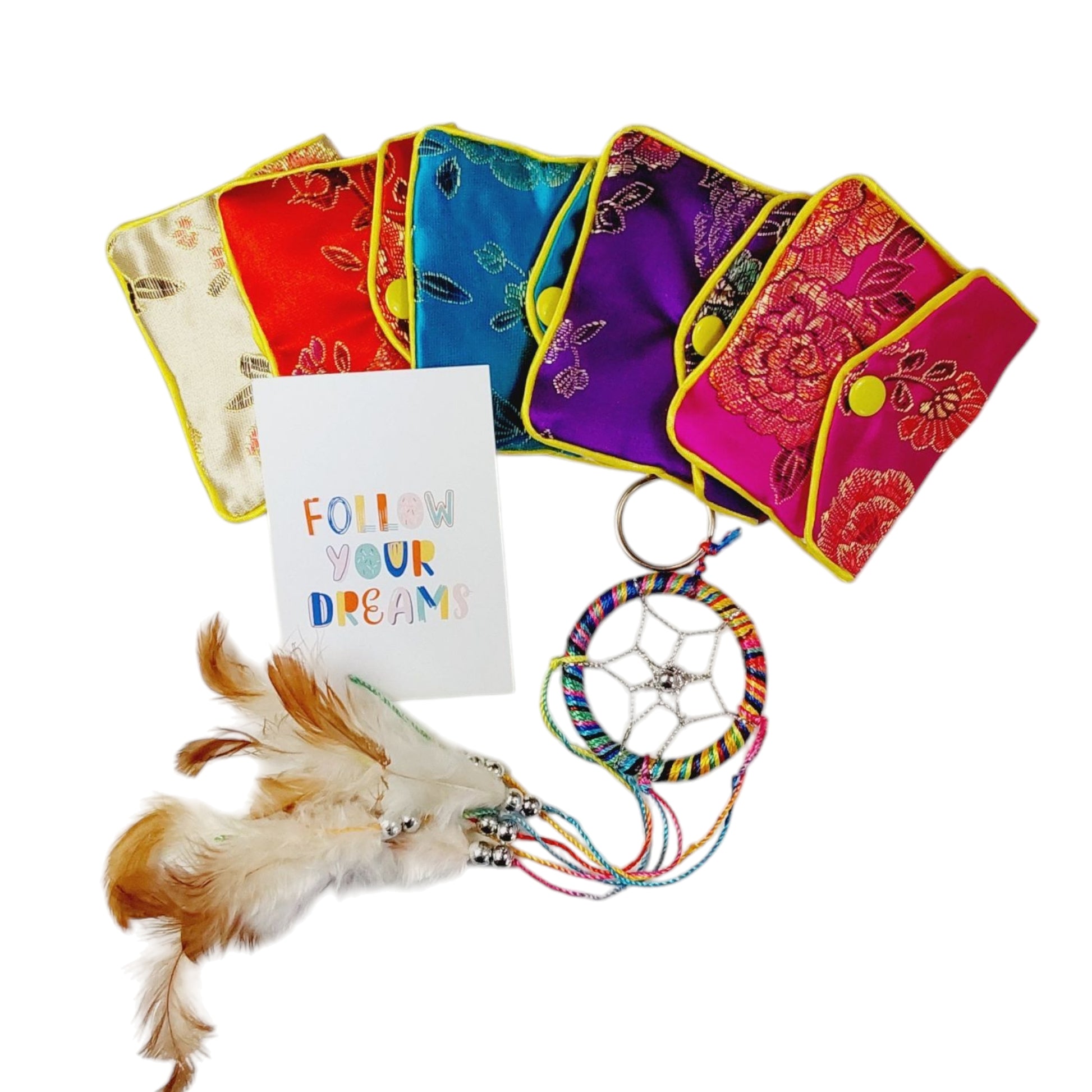 Chinees buideltje met een sleutelhanger dromenvanger. Zowel het buideltje als de dromenvanger worden geleverd in gemixte kleuren. Bij het buideltje zit ook nog een kaartje met de tekst 'Follow your dreams".
