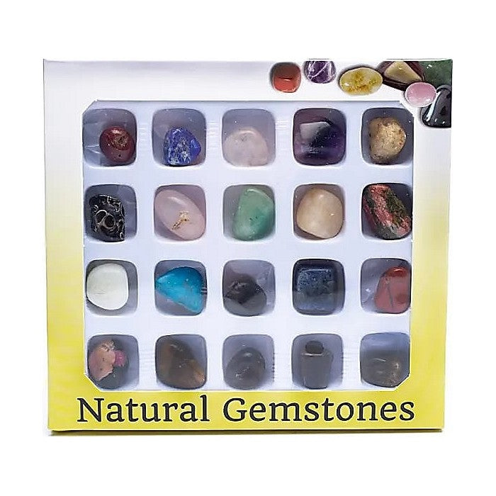 Kartonnen geschenkverpakking met 20 verschillende assorti trommelstenen, zoals carneool, lapis, amazoniet, rozenkwarts, pyriet, jaspis, citrien (gebrande amethist), aventurijn en nog veel meer. Aan de achterzijde zit een foto van elke steen in het doosje.