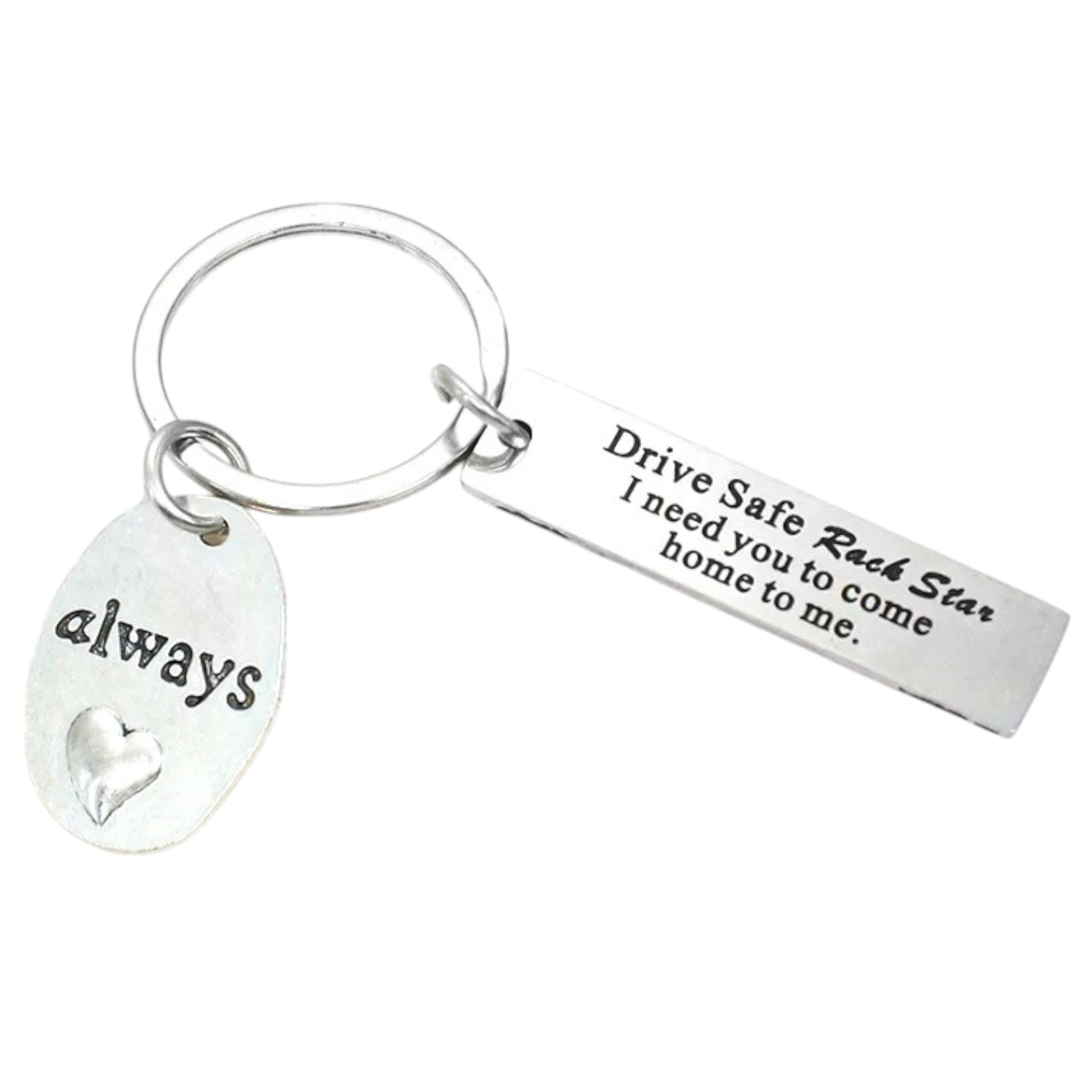 Sleutelhanger om iemand veilig te laten rijden. De sleutelhanger bestaat uit 2 bedels. Op de ene bedel staat 'drive safe rockstar. I need you to come home to me' en op de andere bedel staat 'love always'.