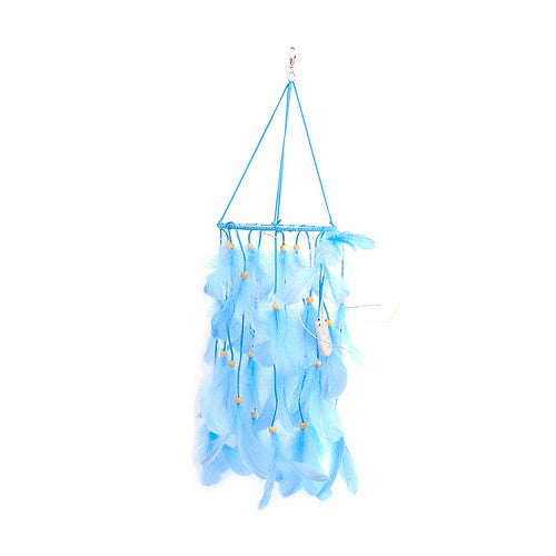 Dromenvanger waarvan de grote ronde met een doorsnede 15 cm horizontaal hangt. Aan de ronde hangen lichtblauwe veren en lichtjes. Daarnaast hangen aan de strengen houten kralen.