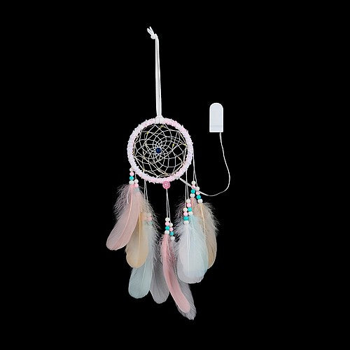 Dromenvanger met zeer mooie pastelkleurige veren en lichtjes. De grote ronde van de dromenvanger heeft een doorsnede van 12 cm. Om deze grote ronde zit wit roze gekleurd garen gewikkeld. In de veren in de kleuren lichtroze, lichtgroen en wit zitten kleine lichtjes.