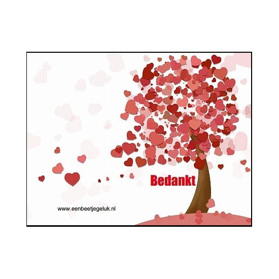 Dubbel kadokaartje 5,5 x 8,5 cm. Op de voorzijde staat een hartjesboom die doorloopt op de achterzijde. Op de voorzijde staat ook de tekst 'bedankt'. Aan de binnenzijde kun je een eigen tekst kwijt want hier is het kaartje blanco.