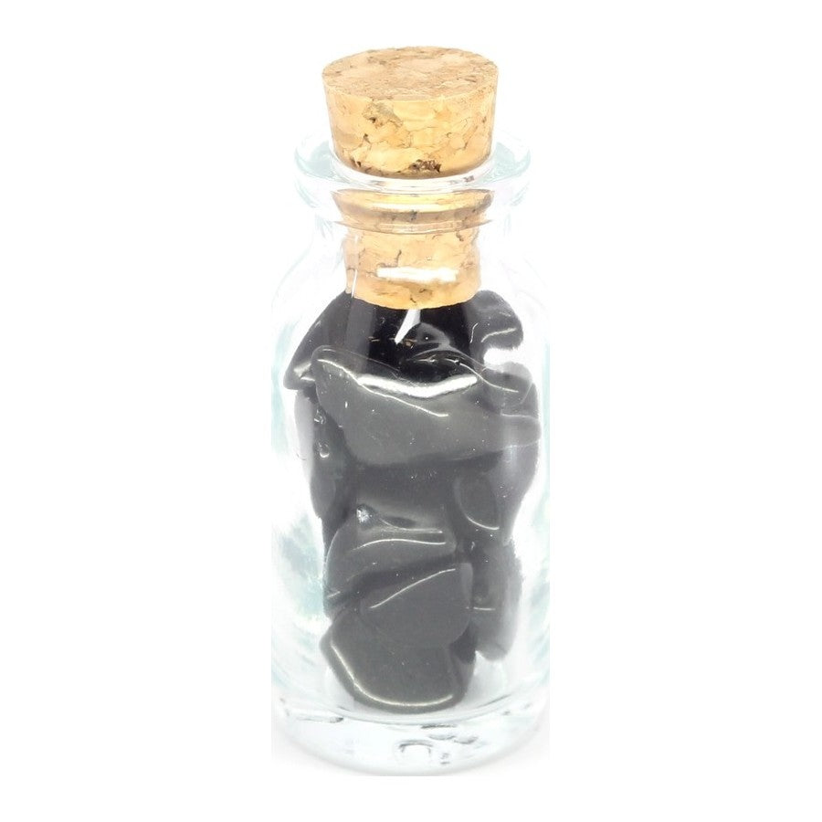 Flesje 4 cm groot met kleine onyx steentjes (8 - 12 mm). De steen geeft steun, kracht en doorzettingsvermogen en helpt je je doelen te bereiken. Het maakt standvastig, besluitvaardig en verantwoordelijk en stimuleert zelfverwezenlijking.