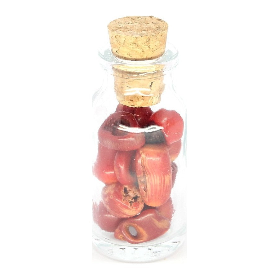 Flesje 4 cm groot met rode koraal steentjes (8 - 12mm). De energie* van rode Koraal brengt levensvreugde, kracht, meer energie en vermindert sociale angsten en spanningen. Ze ontlaadt opgekropte gevoelens, brengt ze in evenwicht en helpt deze positief te kanaliseren.