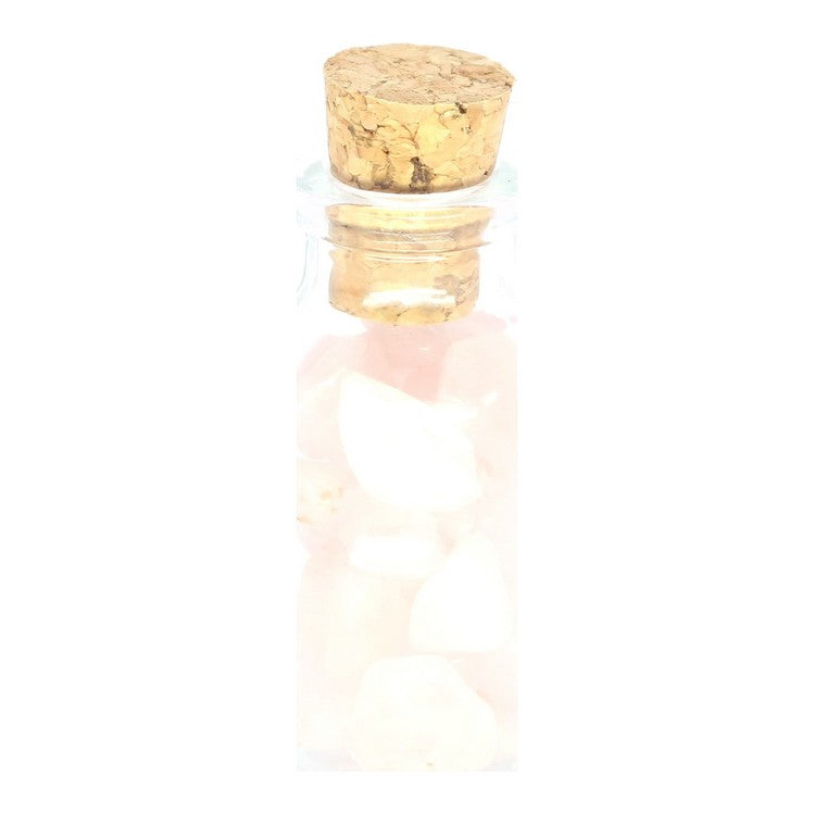 Flesje met rozenkwarts steentjes. Het flesje is 4 cm groot. De steentjes van rozenkwarts die er in zitten zijn 8 - 12 mm groot. Rozenkwarts is bij uitstek de steen van het hart en de liefde. De steen werkt sterk in op het hart chakra en opent het hart om liefde te ontvangen en om liefde te geven.