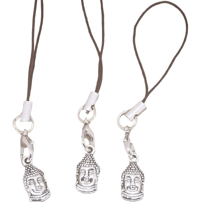 Metalen boeddhahoofdje aan een telefoonkoordje. Dit kun je gebruiken als gelukspoppetje of gelukshangertje aan een kadootje of sleutelhanger.