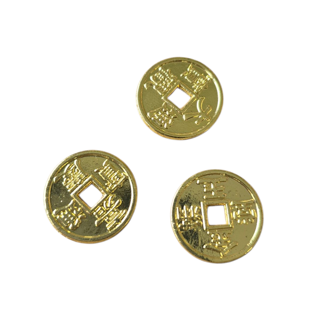 Klein goudkleurig Chinees geluksmuntje met Chinese tekens. Het Chinese geluksmuntje is een oud en krachtig symbool uit de Chinese cultuur en Feng Shui, voornamelijk bekend om het aantrekken van financiële welvaart, rijkdom, geluk en succes. De traditionele vorm, rond met een vierkant gat, symboliseert de essentiële harmonie tussen Hemel (het ronde deel) en Aarde (het vierkante gat). Door ze in een portemonnee te dragen of ze op een strategische plek in huis te plaatsen (vaak samengebonden met een rood koord), worden ze gebruikt om bestaande welvaart te beschermen en nieuwe voorspoed en positieve energie aan te trekken.