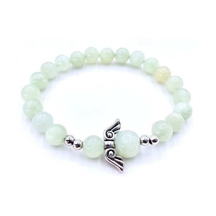 Kadodoosje met een armbandje met jade kraaltjes en een zilverkleurige engelbedel. Bij het doosje zit een uitleg van de betekenis van jade.