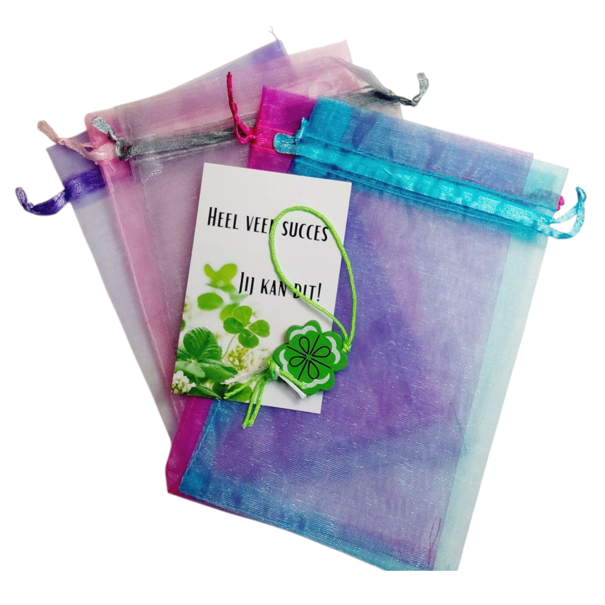 Wens iemand succes met dit kadozakje met kaartje en klavertje 4. Op het kaartje staat de tekst 'heel veel succes, jij kan dit' en een afbeelding van klavertjes vier. Dit zit in een gekleurd organza zakje (gemixte kleuren) met een klavertje vier.