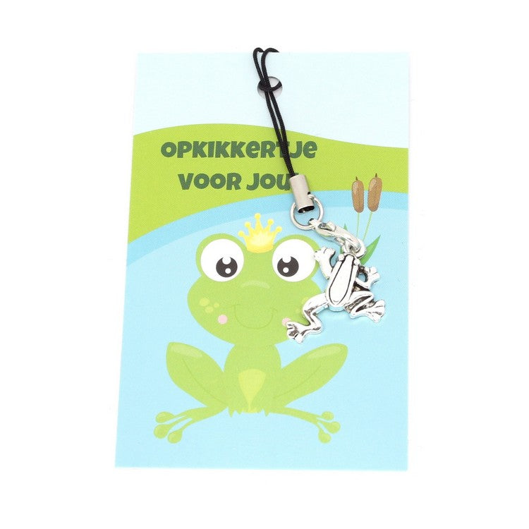 Leuk kaartje 8 x 5 cm groot met een afbeelding van een kikkertje en de tekst 'opkikkertje voor jou'. Aan het kaartje hangt een bedeltje van een kikkertje. Dit hangertje kun je aan het kaartje laten of bijvoorbeeld aan je sleutelhanger hangen.