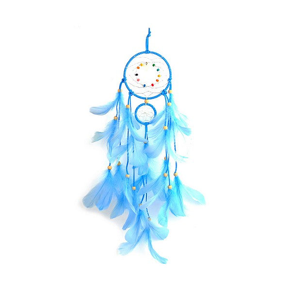 Mooie lichtblauwe dromenvanger met een lengte van 55 cm. In de grote dromenvanger ring zitten kleine gekleurde kraaltjes. Er onder hangt een kleine dromenvanger met een doorsnede van 5 cm.
