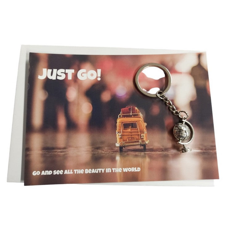 Leuke kaart net de tekst Just Go - go and see all the beauty in the world. Bij de kaart zit een envelop. Daarnaast een leuke sleutelhanger met een wereldbol. Leuk kadootje voor iemand die op reis wil gaan of binnenkort vertrekt.