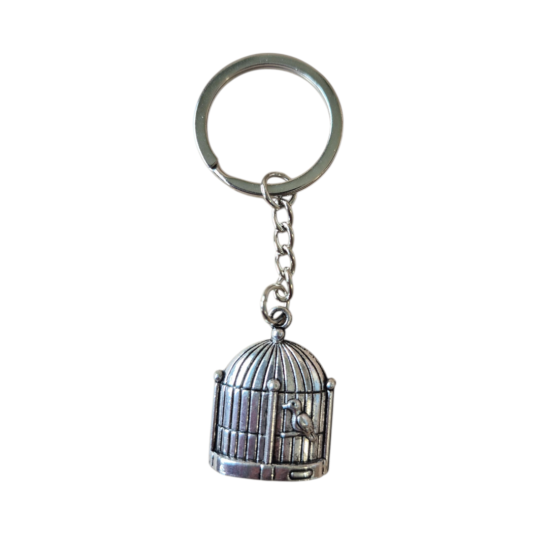 Sleutelhanger van een vogelkooitje. De bedel aan deze sleutelhanger is 3 cm groot.