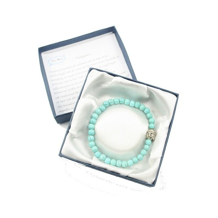 Armbandje met turkoois steentjes en een zilverkleurig hoofdje. Deze armband wordt geleverd in een kadodoosje en een uitleg van turkoois.