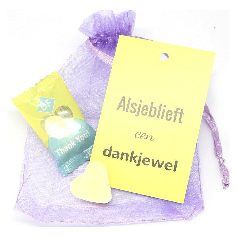 Organza kadozakje met een kaartje met de tekst 'Alsjeblieft een dankjewel' met daarin 2 vruchtenhartjes. Ieder vruchtenhartje zit in een zakje met het woord 'bedankt ' in een taal van de wereld.